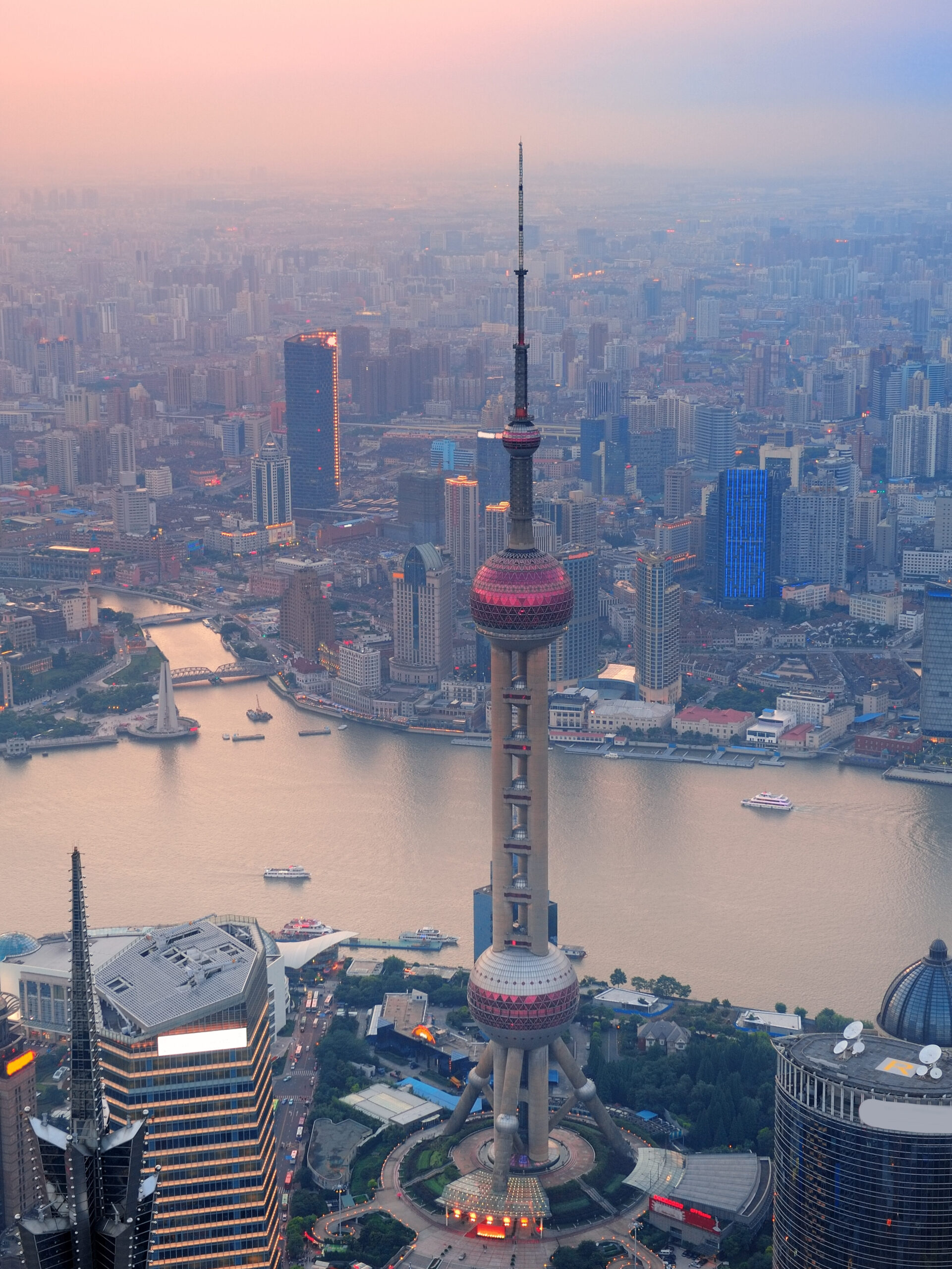 Shanghai aerial view at sunset with urban skyscrapers over river